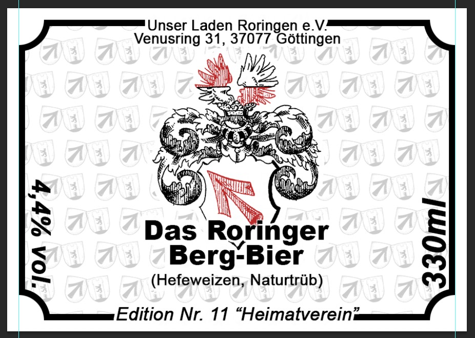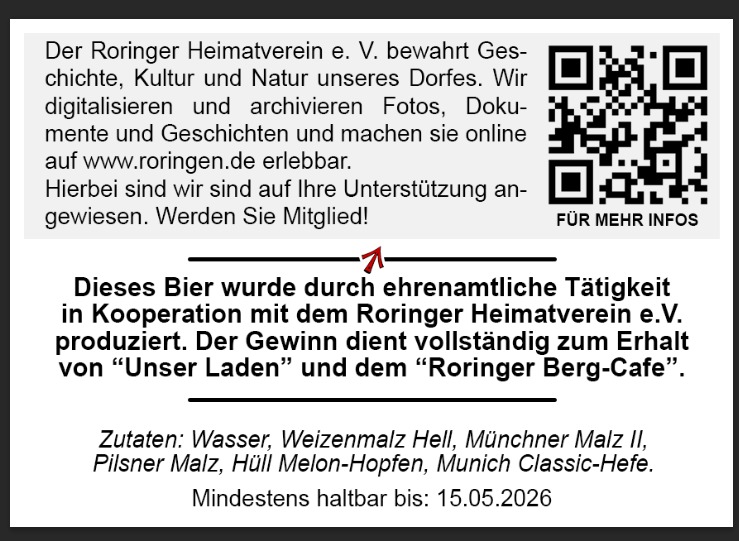 Die "Bierbrauer aus Roringen" sind eine ehrenamtliche Gruppe die in Kooperation aus dem Roringer Heimatverein e.V. und Unser ""Laden"" e.V, Bier für den Erhalt unserer Dorfbegegnungsstätte braut. Das Etikett ist mit dem alten Familienwappen der "Herren von Roringen" verziert. Es ist nicht nur ein köstliches Getränk, sondern auch eine Erinnerung an die lokale Identität. Wir widmen jedem Brauvorgang einem bestimmten Thema im Ort und die Etiketten auf der Rückseite der Bierflaschen erzählen auf moderne und spannende Weise die Geschichten, die das Dorf prägen.